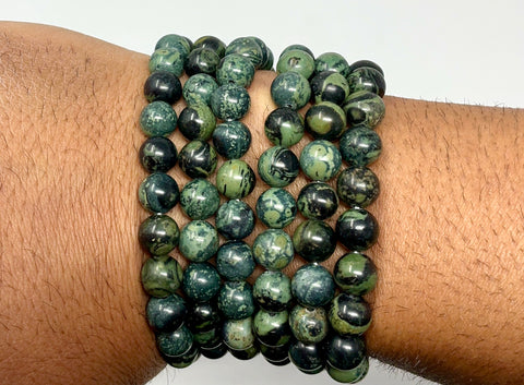Our Natural Kambaba Jasper bracelet features deep forest green tones with dramatic black swirling orb patterns. Every bead is completely unique, showcasing the stone’s signature circular formations.